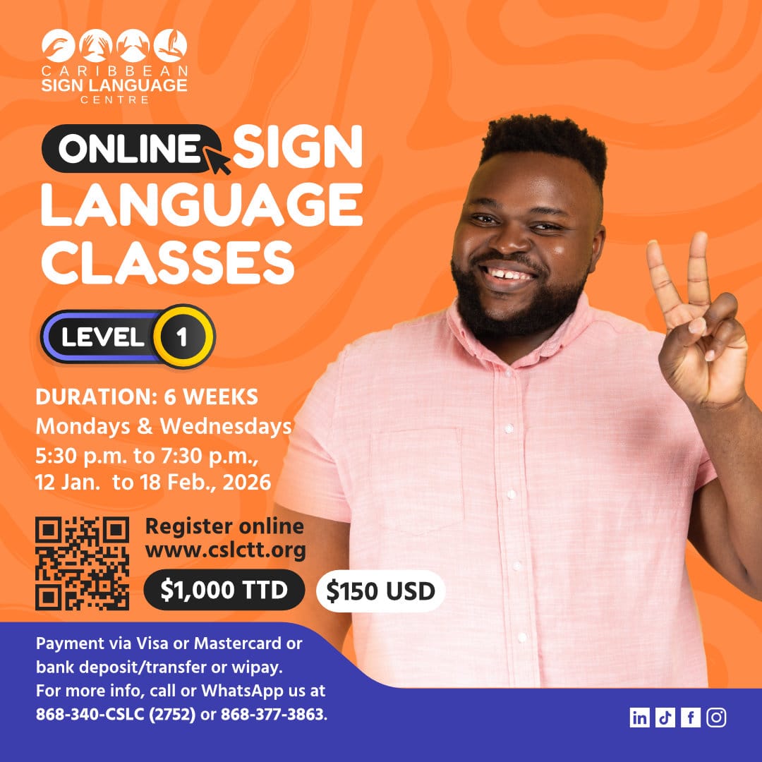 Our highly interactive online Level 1 course will teach you the basics like the alphabet and numbers, as well as vocabulary that will enable you to have proper conversations, including signs for everyday items around the home like food and furniture, family members, emotions, feelings, colours, time (including the days of the week, months etc.,) animals, vehicles, occupations, and so on. Cyber sign language – terminology, slang and other vocabulary relevant to the modern technological age of the internet, social media and AI – is a unique feature of our course. Signs pertaining to sports are also covered, including signs about cricket: we are in the West Indies after all!